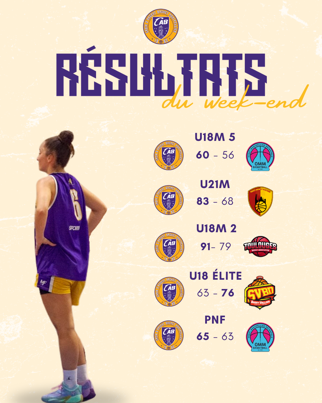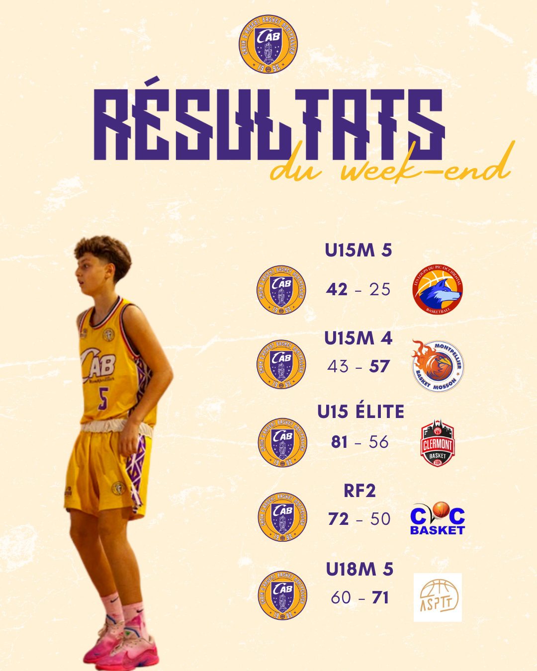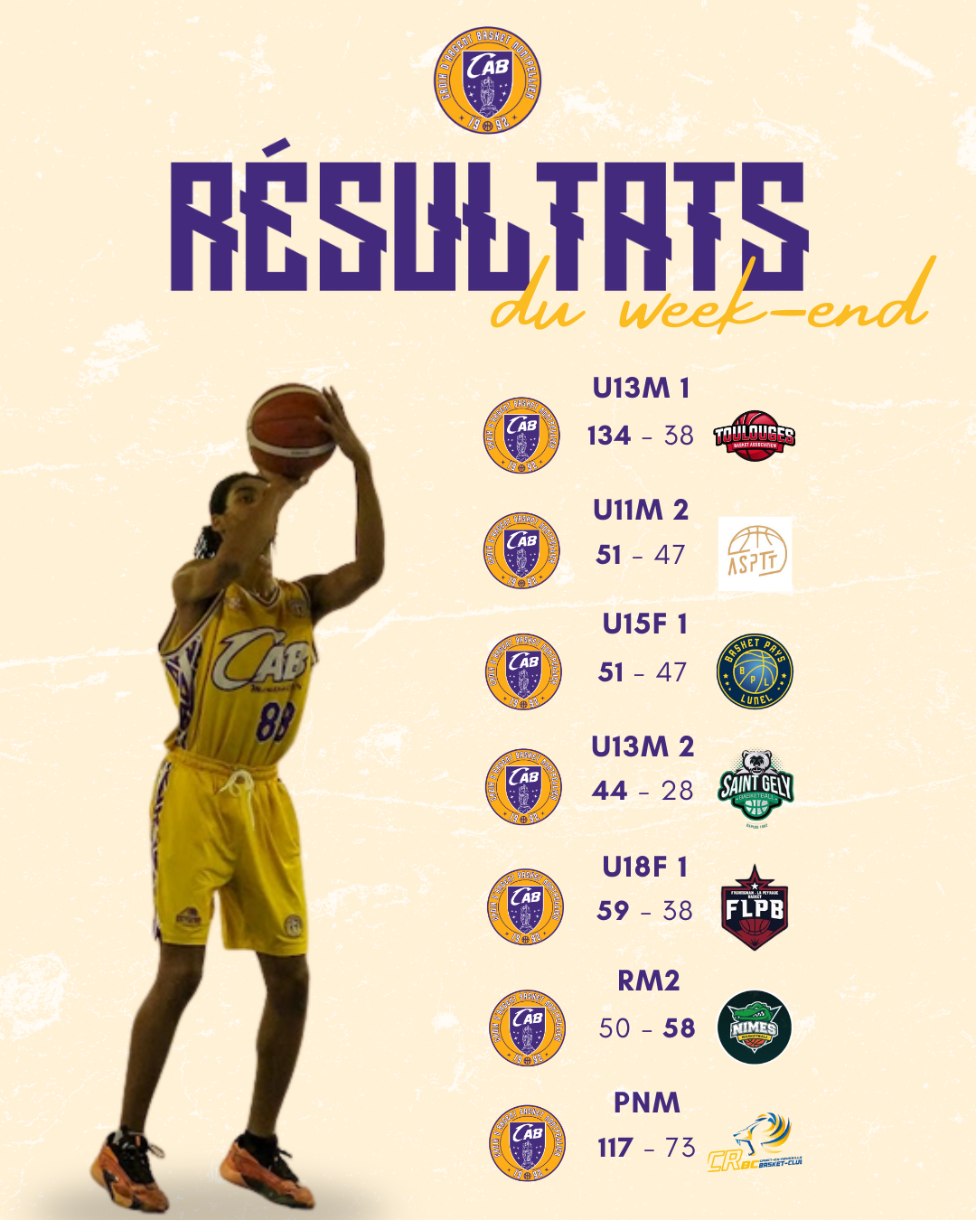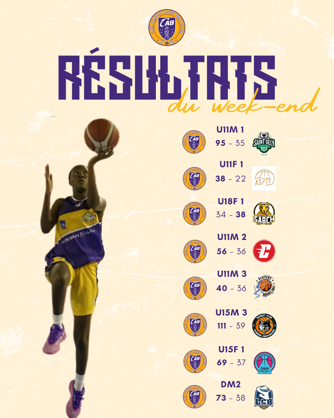 RESULTATS % De victoires pour cette semaine 15-16 Novembre 17 victoires pour 7 défaites. Les séniors filles continuent leurs séries. A noter le 4/4 chez les U11 les 3 équipes garçons et l’équipe fille remportent les matchs…. 10 OCTOBRE 3 OCTOBRE U18M CAB 2 U11M CAB2 SM CAB1 U13 CAB1